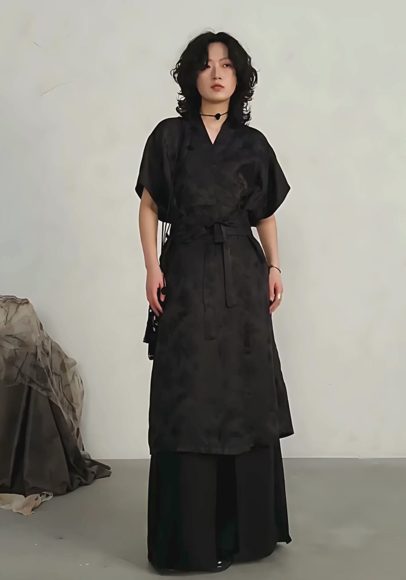 Cette robe kimono noire s’inspire directement de l’esthétique japonaise, revisitée dans une version moderne, fluide et facile à porter au quotidien. Sa coupe droite et enveloppante rappelle le kimono traditionnel, tandis que sa longueur midi et sa ceinture à nouer structurent la silhouette avec élégance.