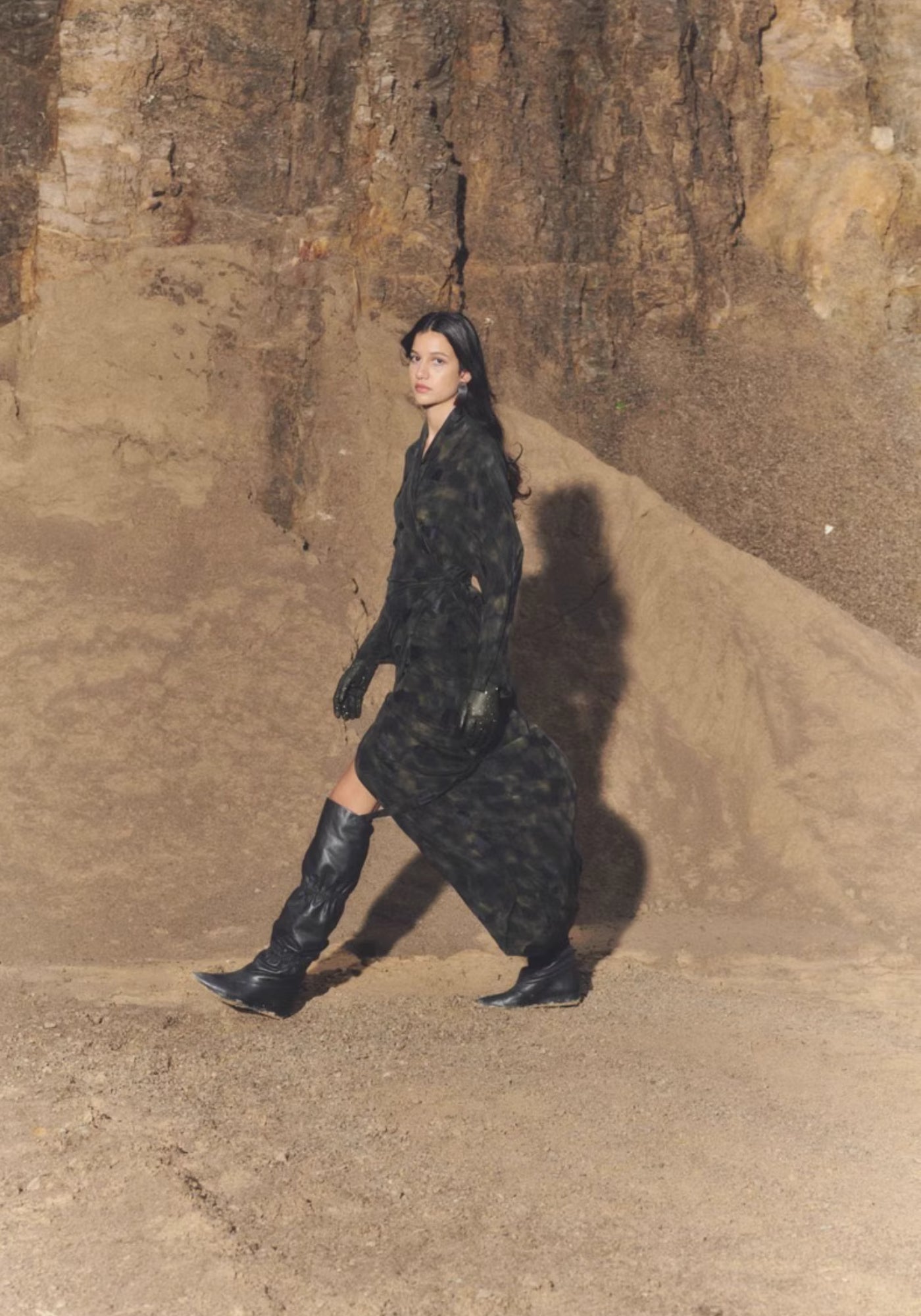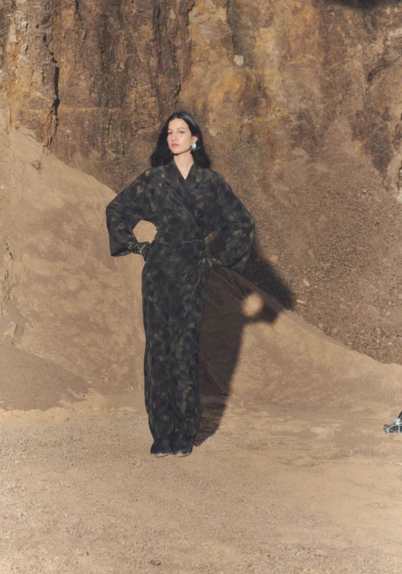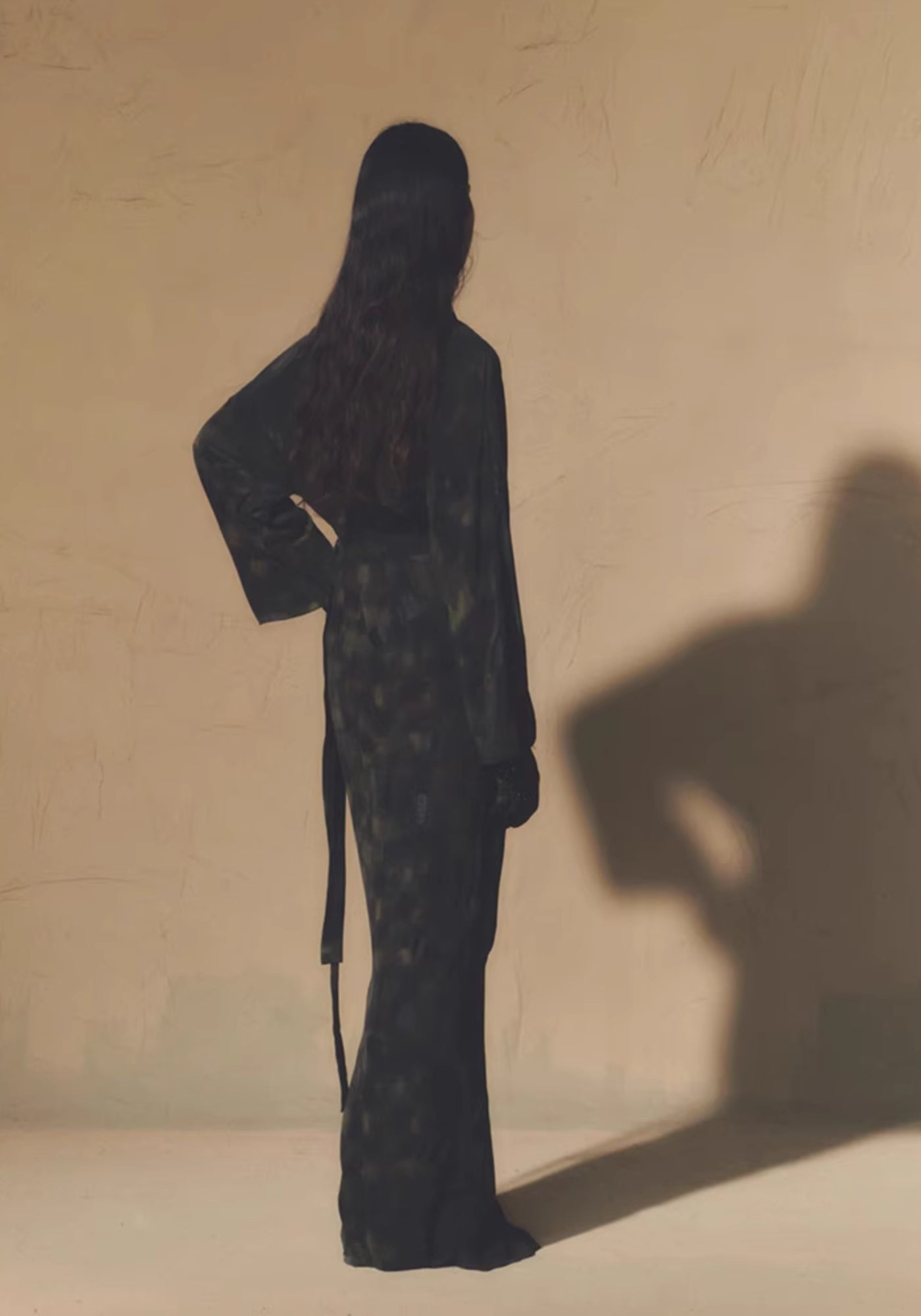 This long silk kimono is designed as a refined, fluid piece that sits between a traditional kimono and a modern wrap dress. Crafted from lightweight silk, it moves beautifully with the body, offering a soft drape and an elegant silhouette. The deep, artistic print blends black, dark olive green and smoky tones, creating a sophisticated look that feels understated yet distinctive.