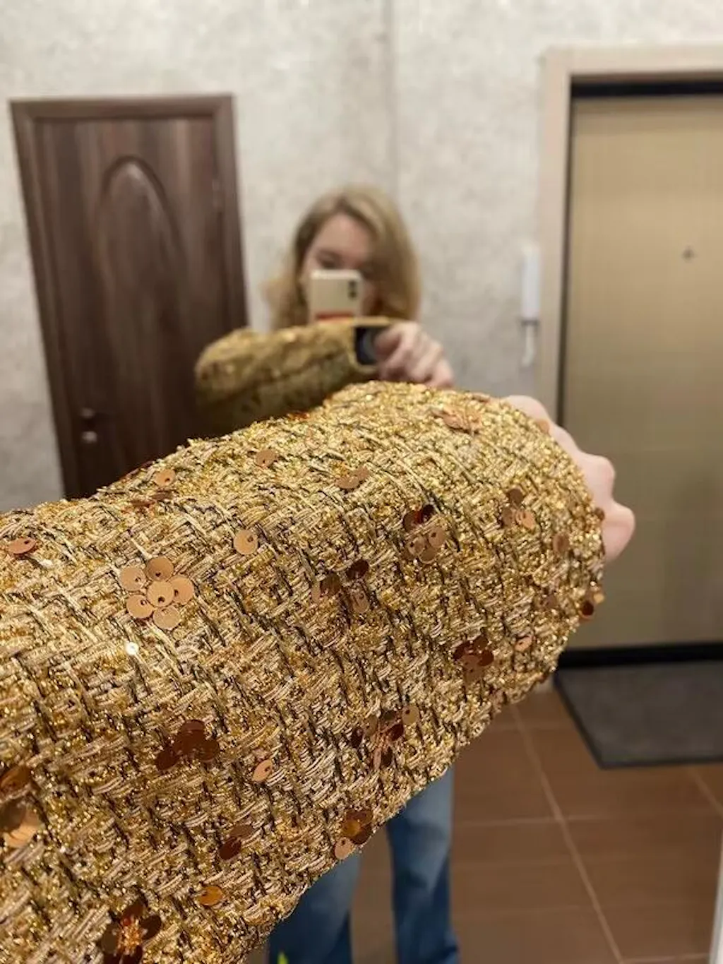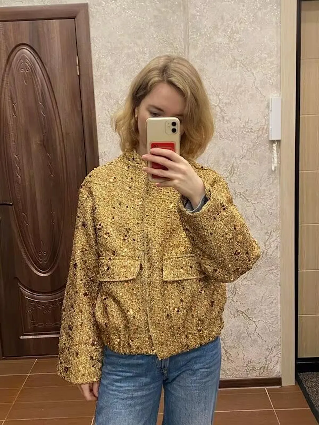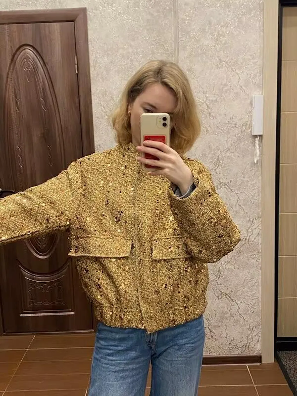 Fully lined for comfort, it layers beautifully over an evening dress, sleek black jumpsuit or high-waisted jeans for a contemporary contrast. The lightly structured shoulders and long sleeves bring a confident edge, while the subtle sparkle enhances the figure with graceful ease. Whether for a dinner, a party or a special occasion, this piece brings a touch of golden glow to any outfit.