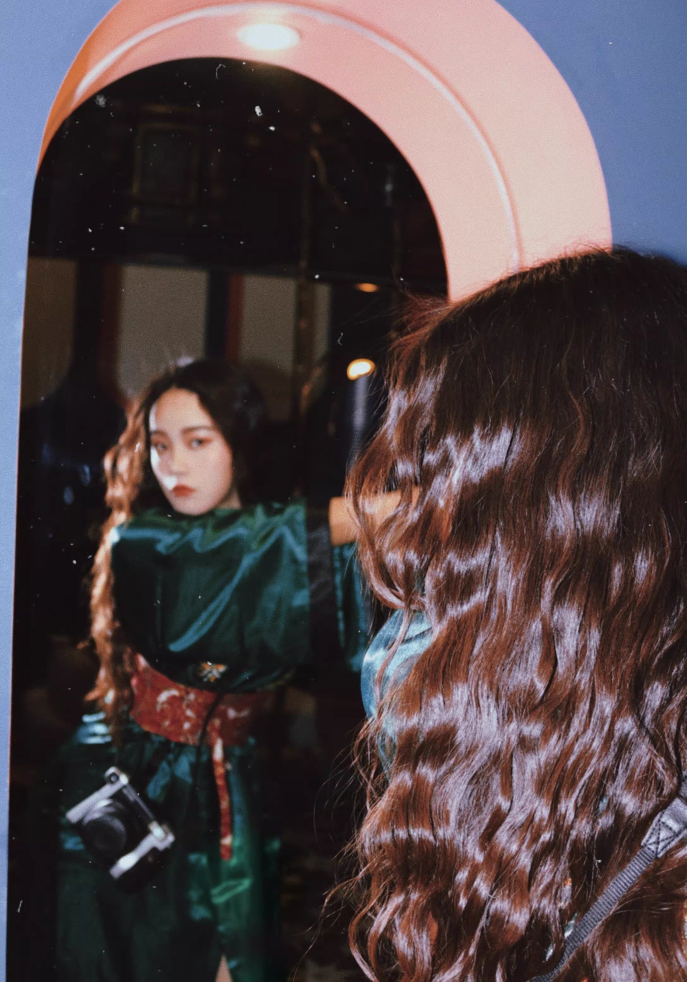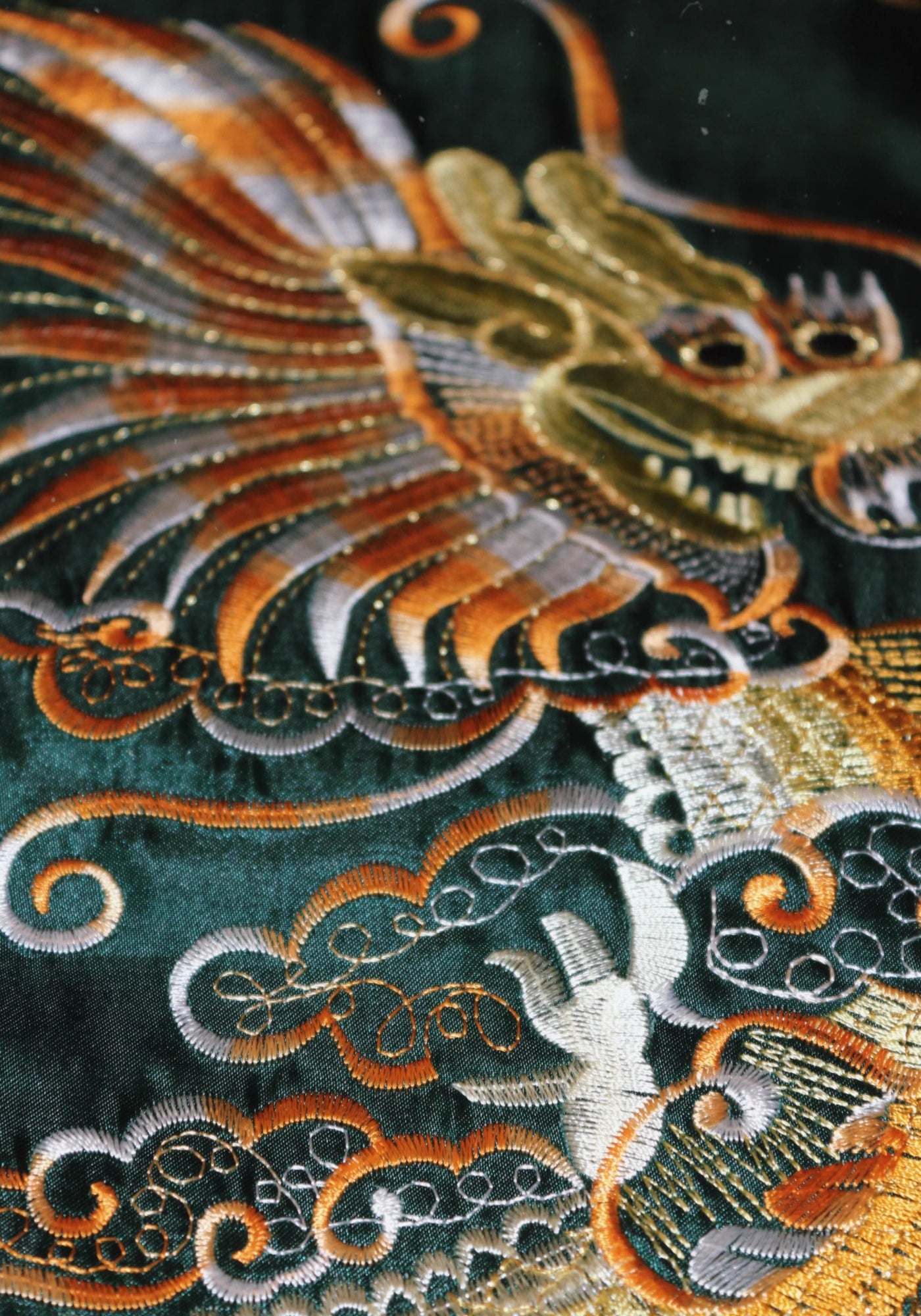 The distinctive feature of this piece lies in its reversible design. One side reveals a rich green tone adorned with Japanese-inspired embroidery influenced by imperial motifs, while the reverse offers a clean, solid black finish for a more understated and modern look. Two styles in one dress — to suit your mood or the occasion.