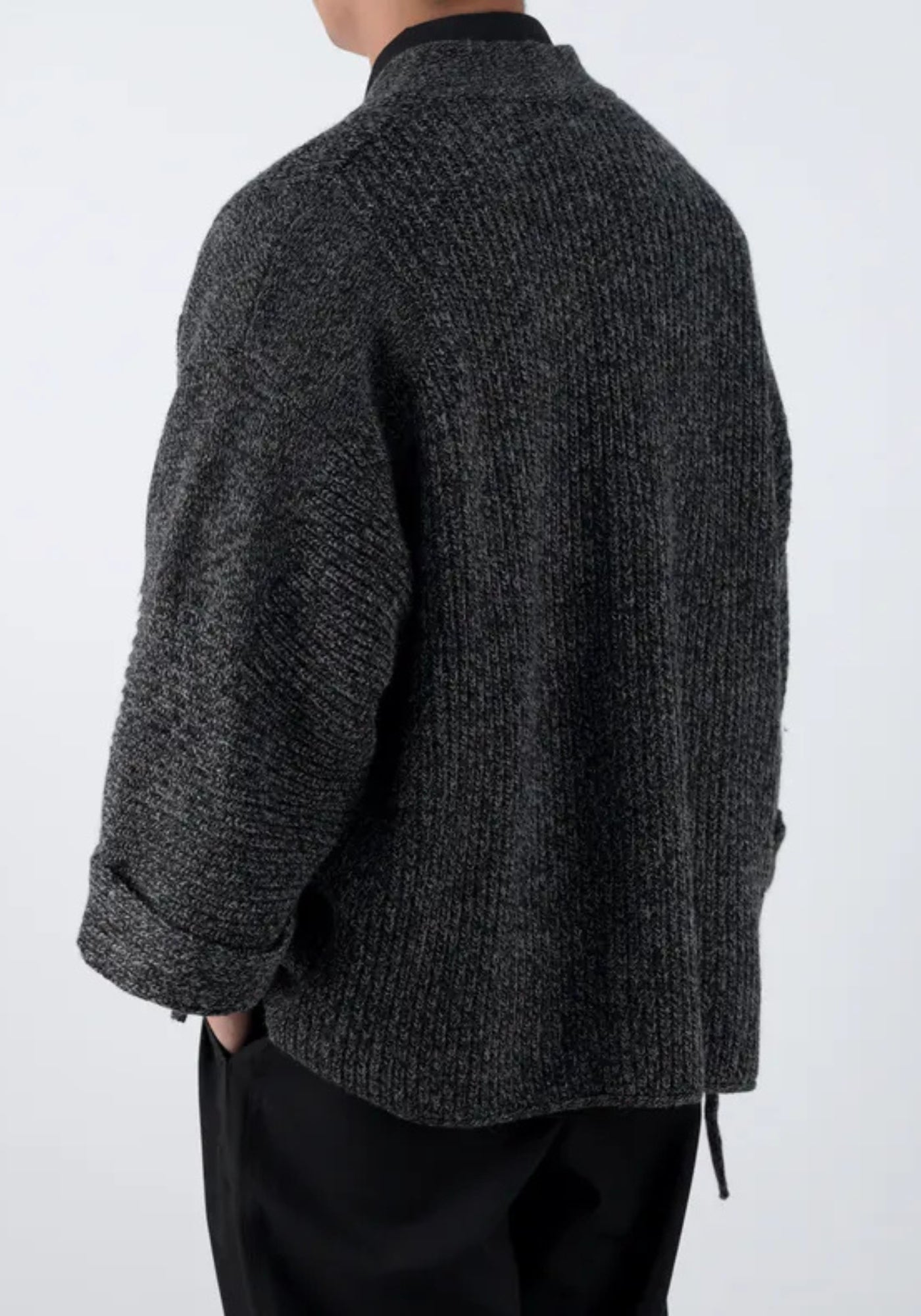 This knitted kimono cardigan blends the cosy warmth of a cardigan with the effortless drape of a traditional kimono. Crafted from a thick, textured knit, it wraps the body in soft comfort while maintaining a refined, structured silhouette. The oversized cut, wide sleeves, and waist tie belt echo the clean lines of the Japanese noragi, for a look that’s both timeless and contemporary.
