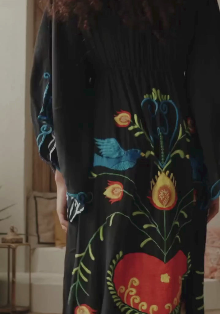 The colourful embroidery, rich in detail, features floral and symbolic motifs inspired by Asian art: stylised hearts, birds and flowing botanical patterns unfold over a deep black background, creating a striking and refined contrast. Each detail feels almost handcrafted, like a truly unique piece.