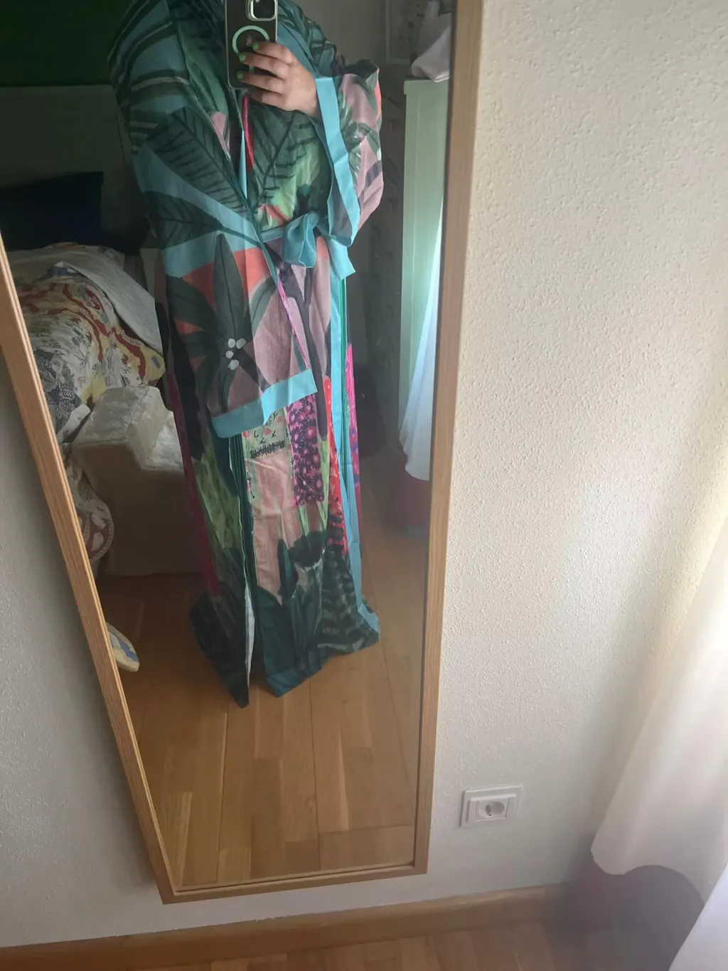 This long kimono instantly captures the spirit of summer escapes and sun-soaked days. Made from a light, breathable fabric, it features vibrant tropical motifs: bold palm leaves, exotic blooming flowers, and colourful accents that bring the lush energy of tropical landscapes to life. Every detail adds a fresh yet elegant touch, perfect for brightening up your summer wardrobe.