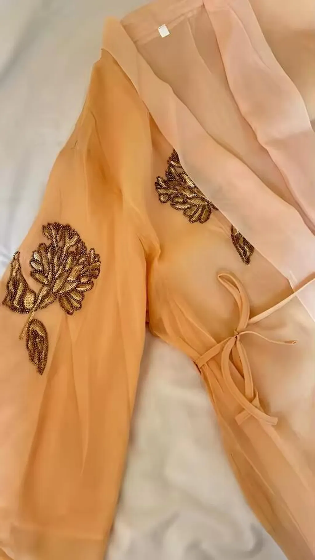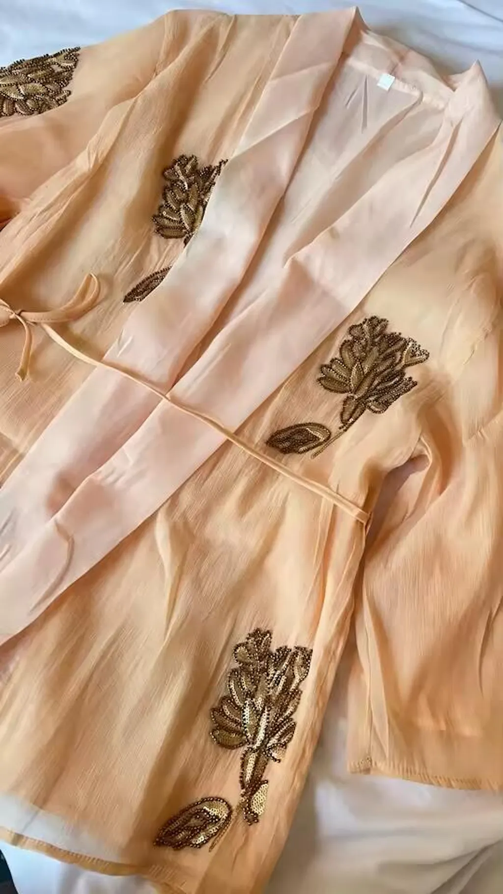 Each embellishment is meticulously hand-placed. Gold bead embroidery and fine sequins form stylised floral motifs, adding subtle texture, dimension and sparkle. Under the light, the embroidered details catch the eye with a gentle shimmer — never flashy, always refined. This embroidered kimono jacket embodies understated luxury and exquisite craftsmanship.