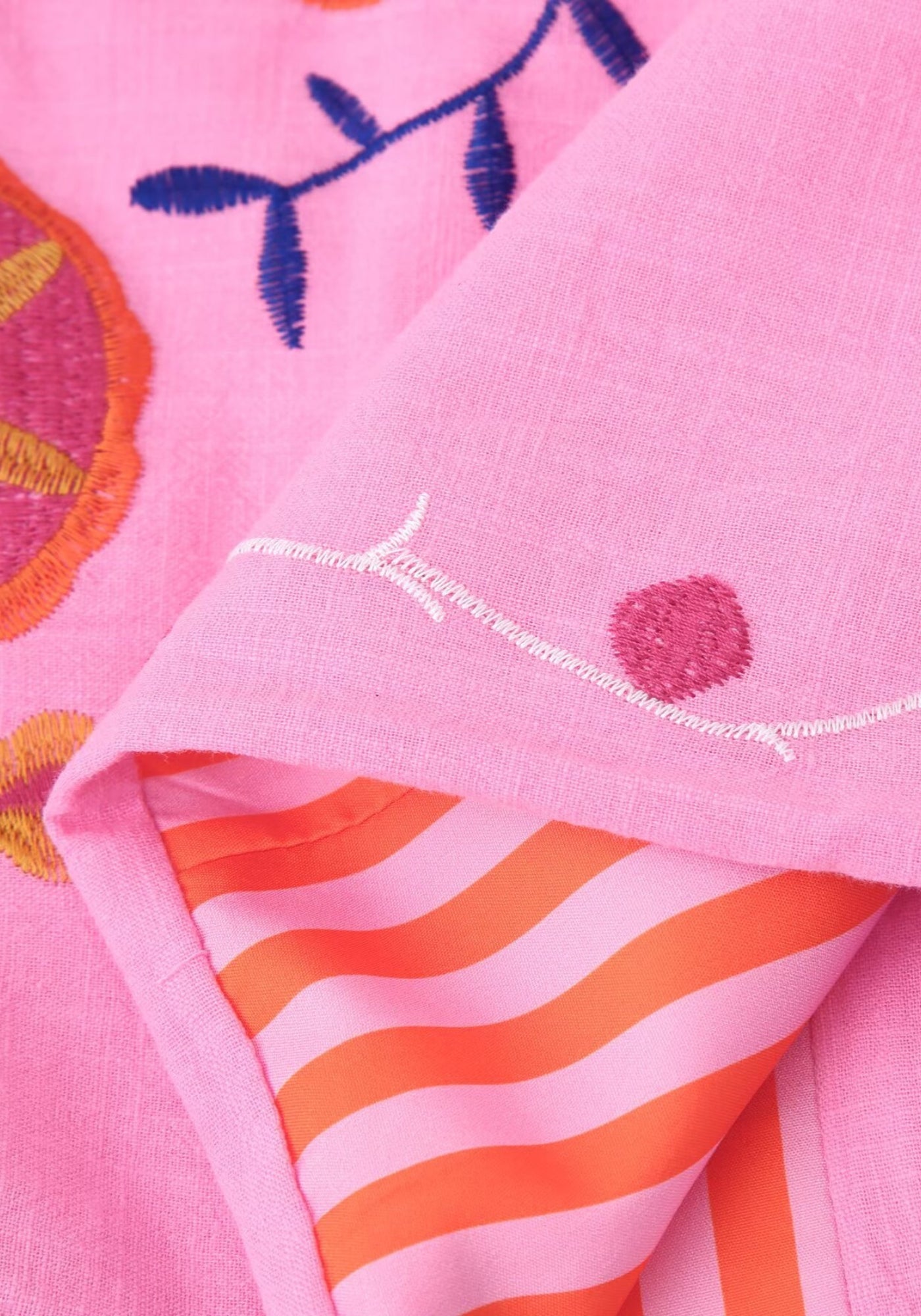 • Striped inner lining and raised embroidery: finishing details that elevate this pink beach kimono well beyond a simple cover-up