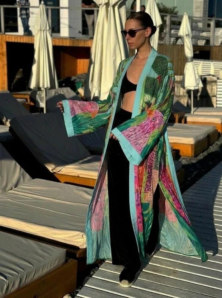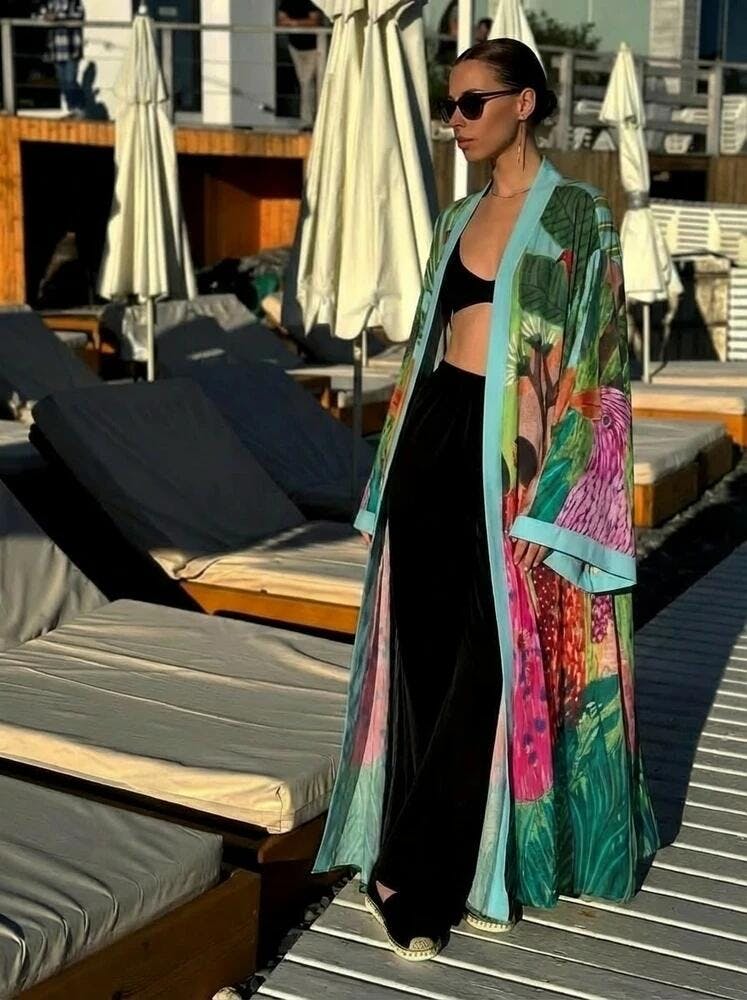 Ce kimono long évoque immédiatement la chaleur des voyages lointains et la douceur des journées d’été. Réalisé dans un tissu fluide et respirant, il se distingue par ses motifs luxuriants : grandes feuilles de palmiers, fleurs exotiques éclatantes et touches colorées qui rappellent la vitalité des paysages tropicaux. Chaque détail apporte une énergie vive et élégante, parfaite pour illuminer vos tenues estivales.