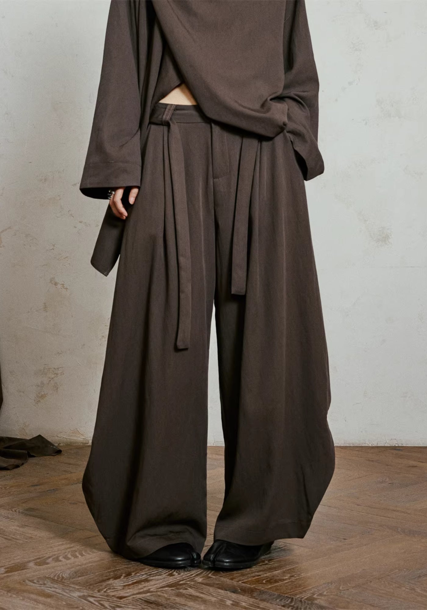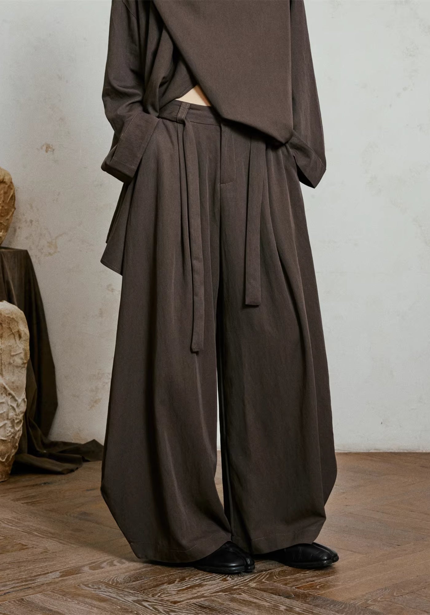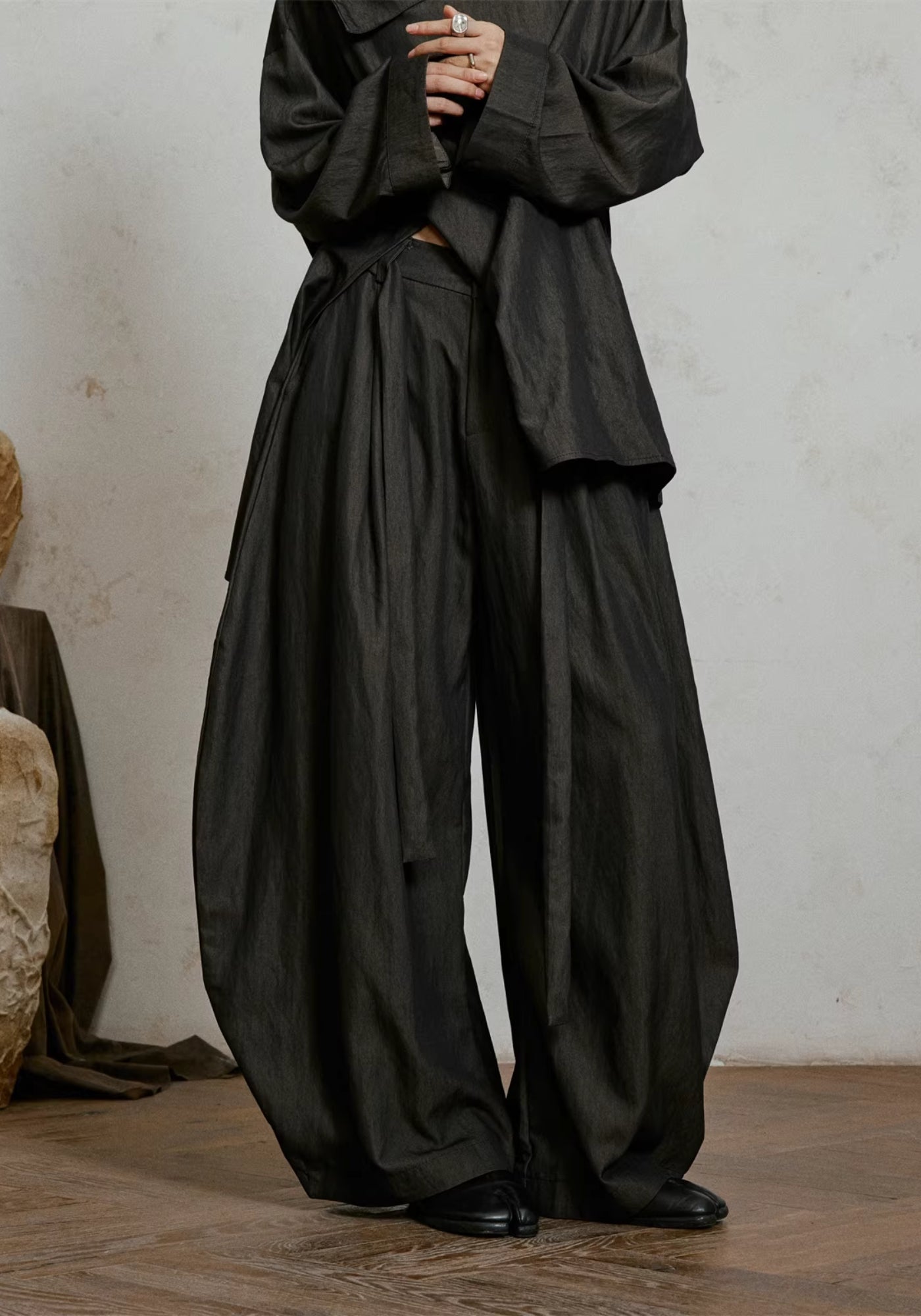 Sa coupe ample et enveloppante crée une silhouette sculpturale, presque flottante. Le tissu tombe lourdement vers le sol, formant des plis profonds qui se déplacent avec le corps, jamais contre lui. À chaque pas, le pantalon s’ouvre, se referme, respire — comme un drapé vivant.