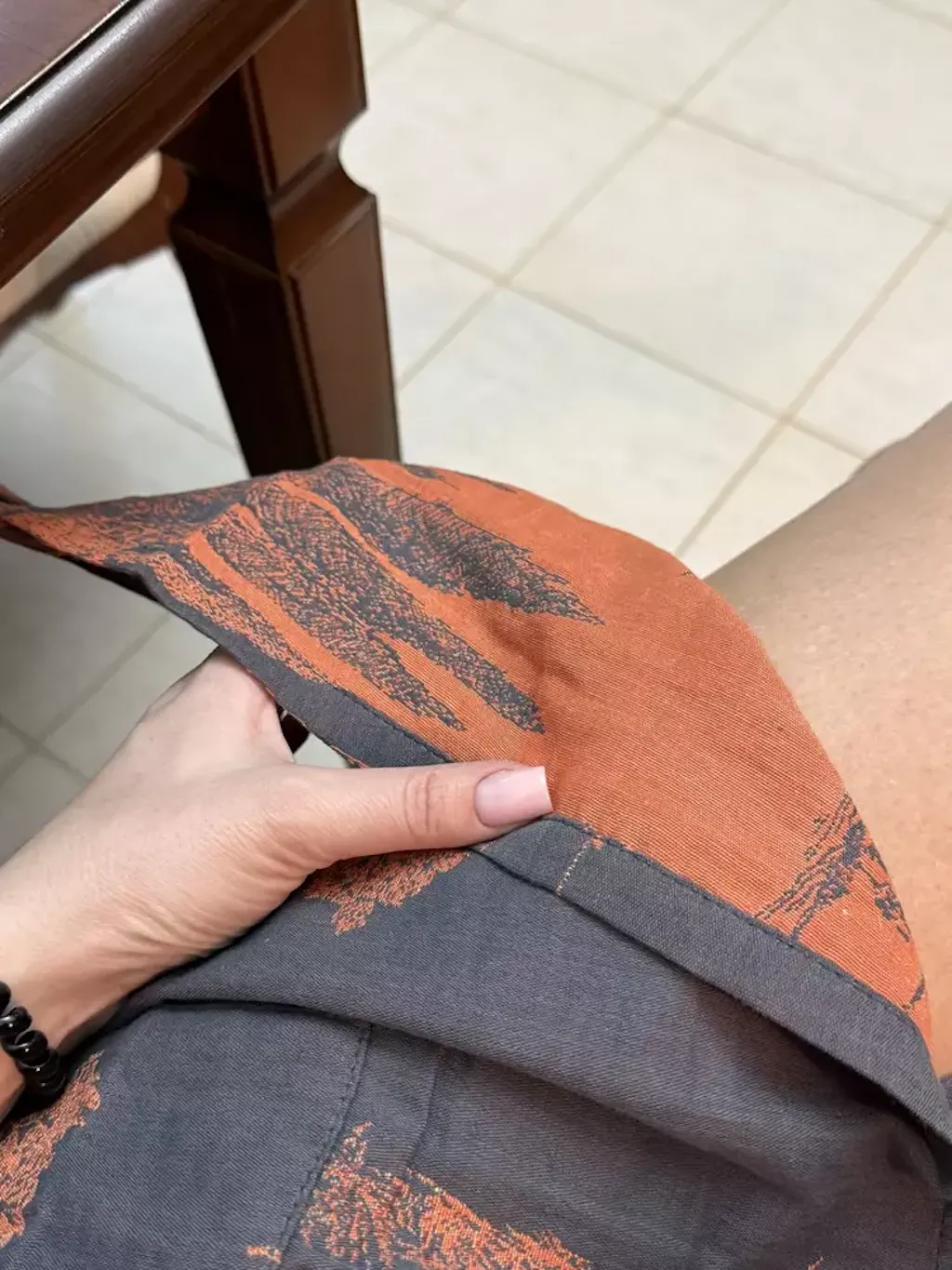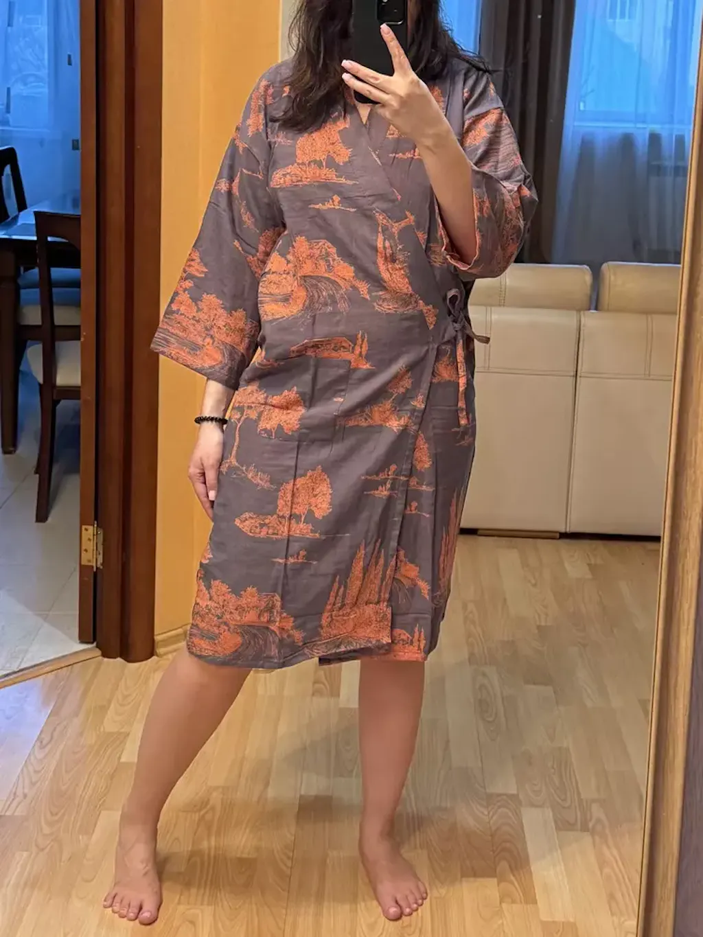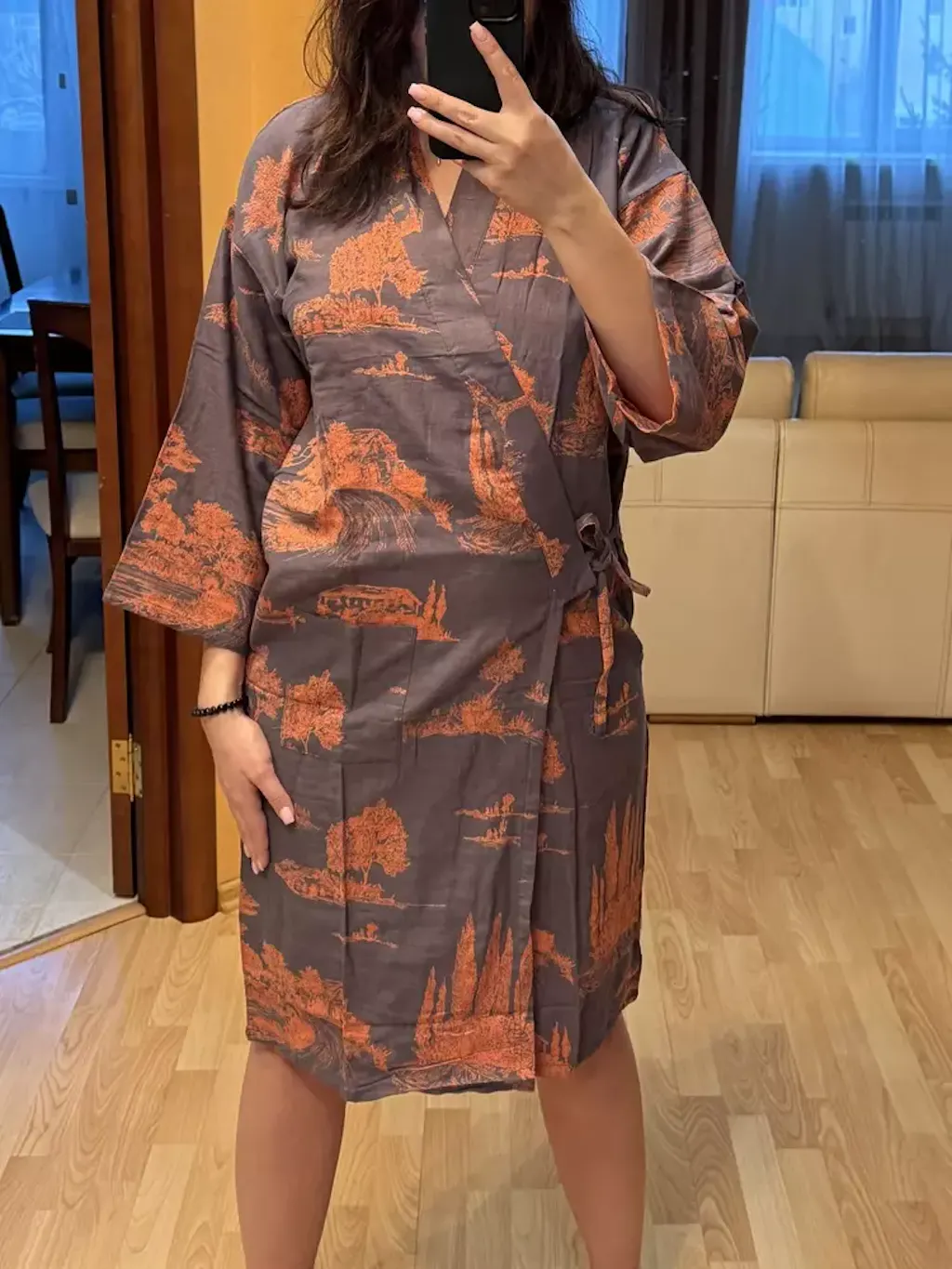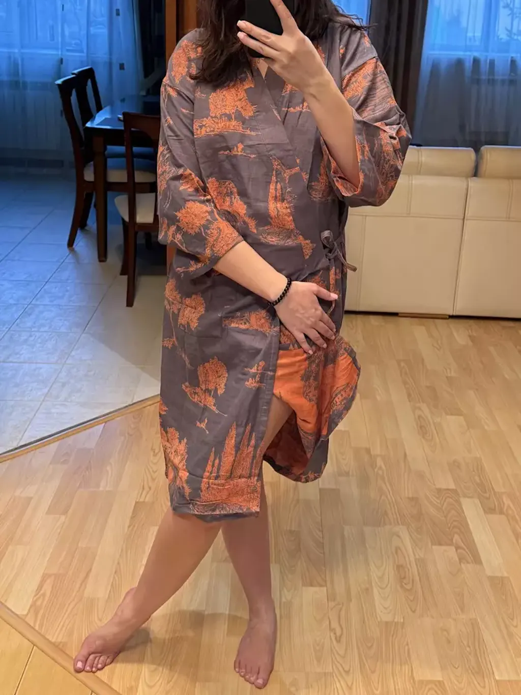 La matière, douce au toucher, présente un fond bleu ardoise aux reflets légèrement changeants, illuminé par des motifs orangés inspirés de paysages et d’arbres japonais. Ce contraste subtil donne au kimono une allure à la fois poétique et moderne. Les manches amples, la ceinture à nouer sur le côté et la coupe droite rappellent l’élégance sobre des kimonos traditionnels tout en restant faciles à porter au quotidien.